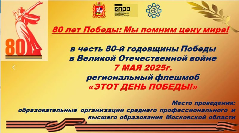 07 мая 2025 года Центр инклюзивного профессионального образования БПОО ГАПОУ МО «ПК «Энергия» приглашает принять участие в региональном Флешмобе «Этот День Победы» в честь 80-й годовщины […]
