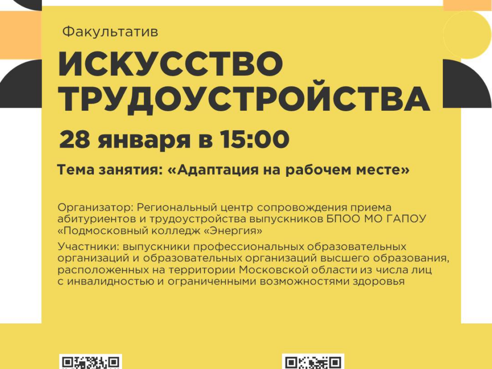 28 января в 15:00 состоится факультатив искусство трудоустройства на тему: «Адаптация на рабочем месте» Ссылка на подключение: https://vk.com/call/join/f4R5CaQAEU2K-43oINCxjhraoh6Mt51NRttjI6XUHRcСсылка для регистрации: https://forms.yandex.ru/u/6780c26690fa7b414c947fb9/